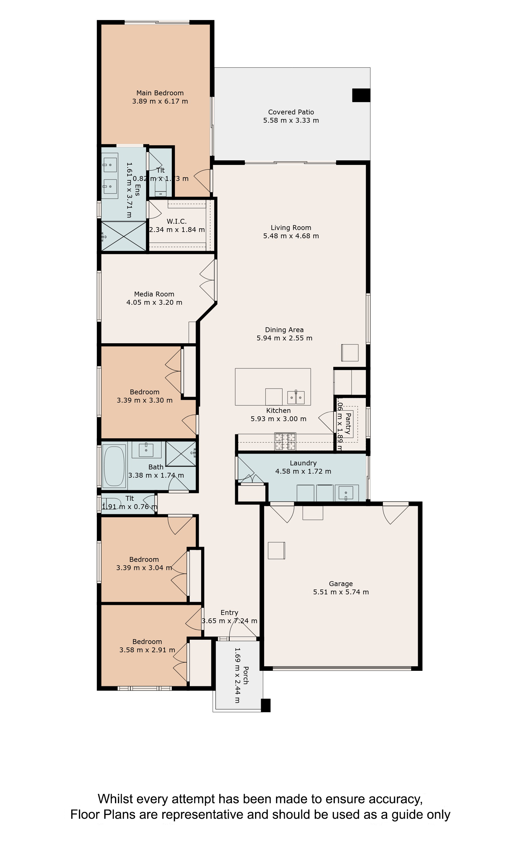 A separate media/lounge room offers versatility for movie nights or a peaceful retreat, while the clever floorplan ensures privacy for every family member. The three generously sized kids' bedrooms are located at the front of the home, each with built-in robes and ceiling fans.